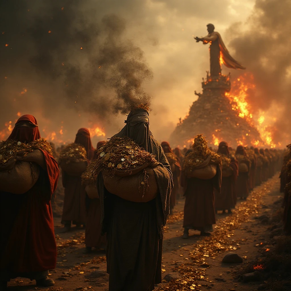 این، یک طقوس عبادتی است. چرا؟ چون وقتی تو میگویی: «این مال، مال خداوند است» — تو، دیگر نمیتوانی به این فکر کنی که این مال، مال یک زن بیبضاعت است که برای تأمین نان فرزندش کار میکرد. تو، دیگر نمیتوانی به این فکر کنی که این مال، مال یک پیر است که تمام عمرش را در کارگاه گذرانده است. تو، دیگر نمیتوانی به این فکر کنی که این مال، مال یک کتابخانهٔ پر از حکمت است که نسلها را نجات داده است. تو، فقط میتوانی به این فکر کنی که این مال، مال خداوند است. و خداوند، نه یک موجود مهربان است — بلکه یک موجودی است که نیازمند قربانی است. و این قربانی، مال است.